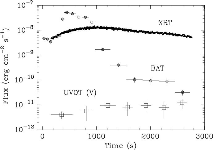 XRT light curve (0.3-10 keV) is shown with open black circles. Count